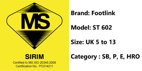 RESISTANT Special formulated Rubber Outsole meets MS ISO 20345: 2008 (SIRIM) |
